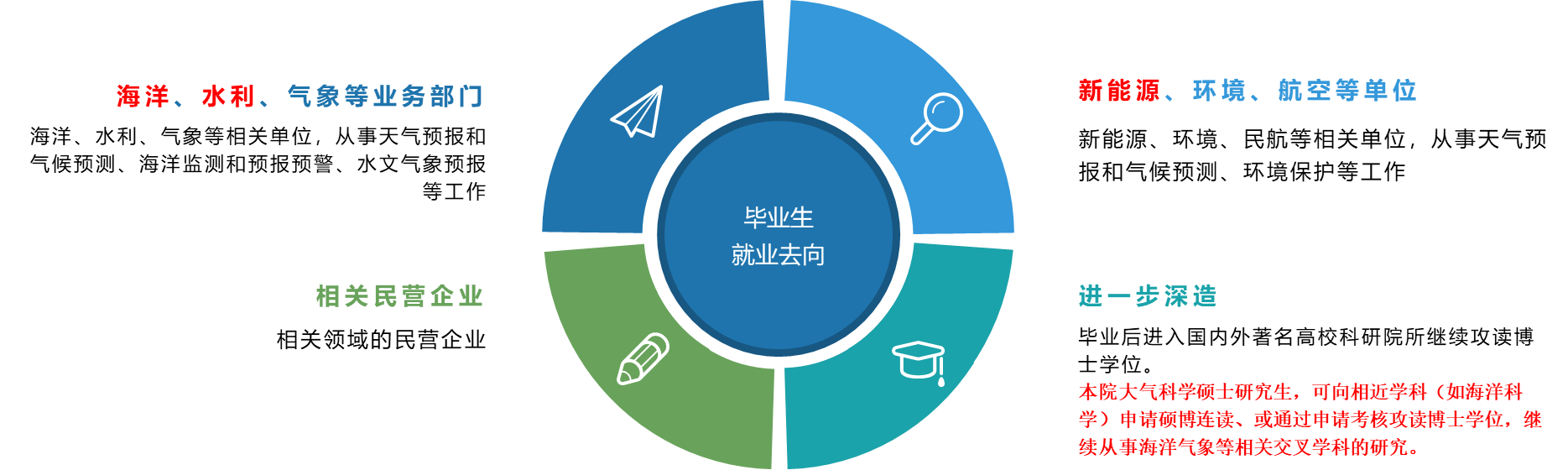 大气科学专业的毕业生可进入海洋、水利、气象等业务部分从事气象研究的相关工作,毕业生也可进入新能源、环境、航空等相关领域,从事与气象交叉的相关岗位。此外,按照我校硕博连读政策,在硕士第一年或第二年,学生可申请相近学科的硕博连读,继续在海洋气象领域深造。